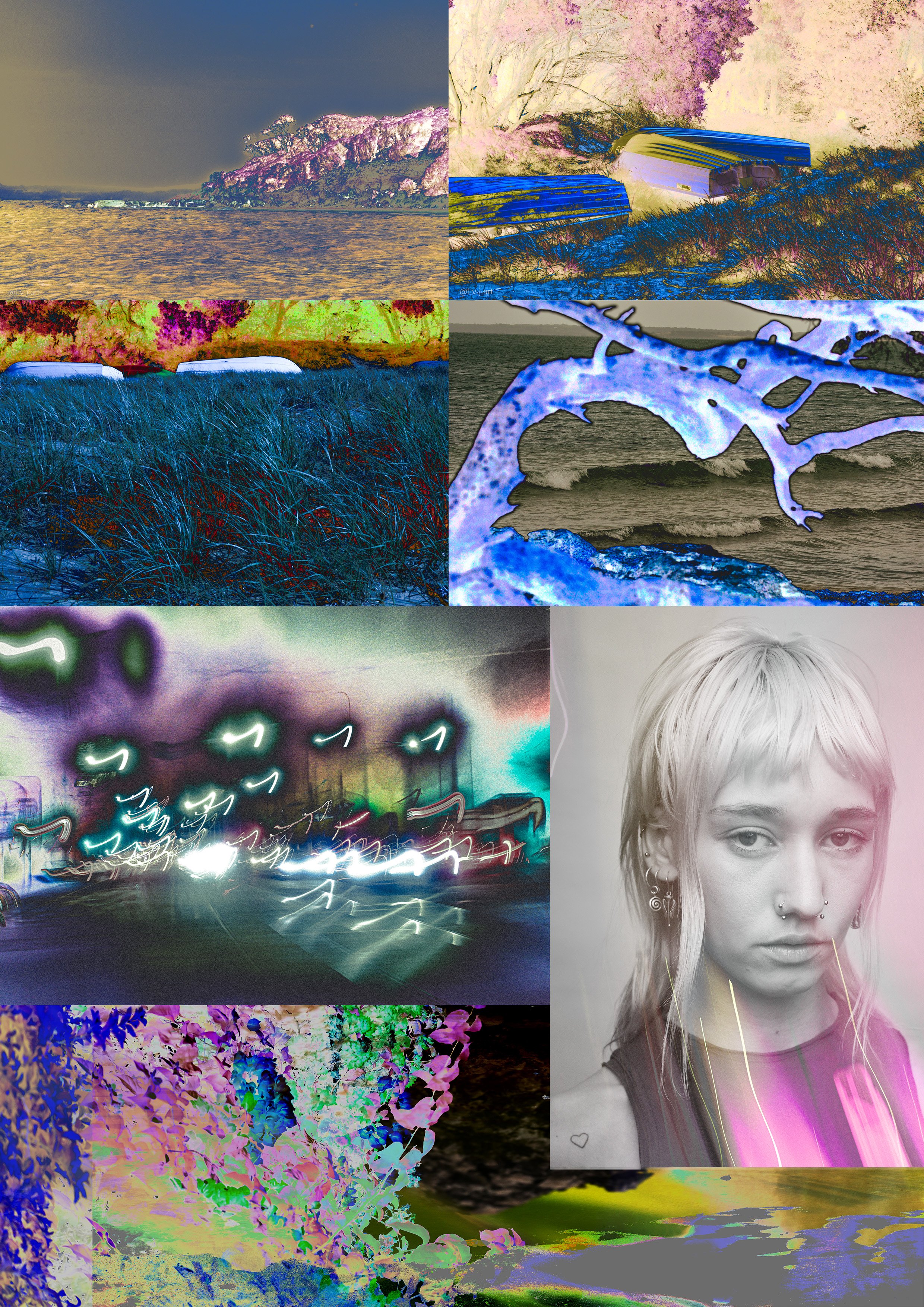 Through a visual language built with both analogue and digital processes.layered imagery and mixed-media experimentation.